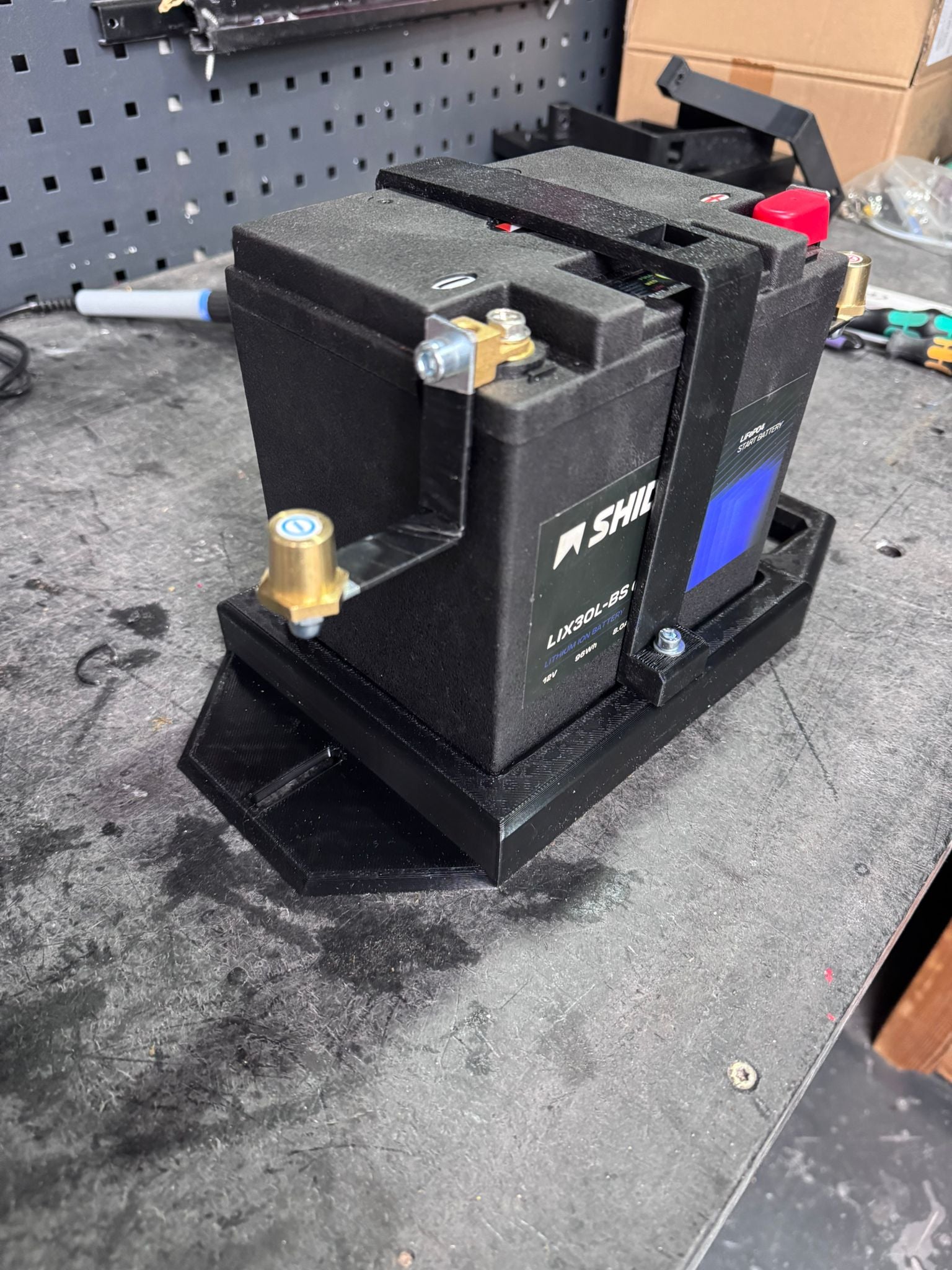 Diese maßgefertigte und im additiven Verfahren hergestellte Halterung bietet sichere Befestigung und optimale Platzierung der kompakten und leichten Lithiumbatterie im Kofferraumboden.